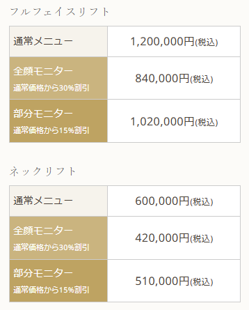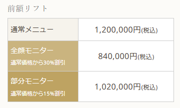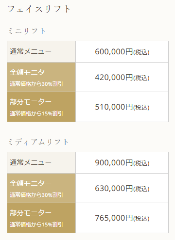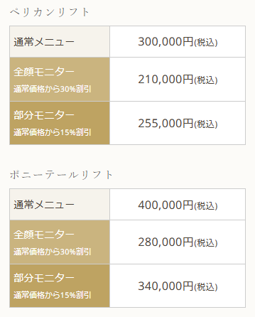 | 施術時間の目安 | ミニリフト 90分 ミディアムリフト 120分 フルフェイスリフト 150分 ネックリフト 60分 ペリカンリフト 60分 ポニーテールリフト 60分 前額リフト 150分 |
